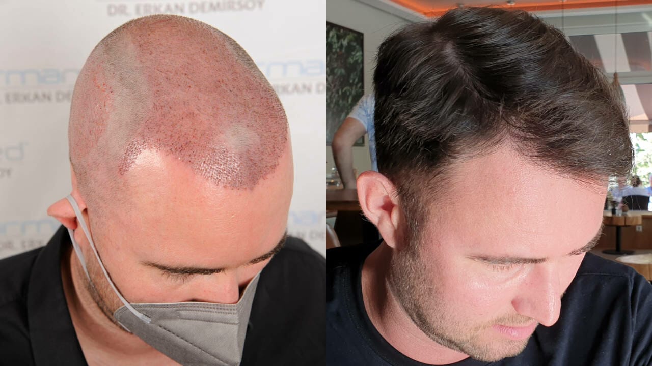 Über 5000 Grafts wurden bei einem von Dr. Gokhan Gurs Patienten benötigt. Der außergewöhnlich große kreisrunde Bereich hinten (Tonsur) und die Geheimratsecken wurden wieder aufgefüllt.